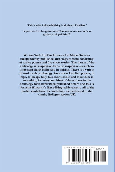 We Are Such Stuff As Dreams Are Made On is an independently published anthology of work consisting of twelve poems and five short stories. The theme of the anthology is: inspiration because inspiration is such an important thing in life and in writing. There is a variety of work in the anthology, from short four line poems, to raps, to creepy fairy-tale short stories and thus there is something for everyone! Most of the authors in the anthology have never been published before and this is Natasha Whearity's first editing achievement. All of the profits made from the anthology are dedicated to the charity Epilepsy Action UK.