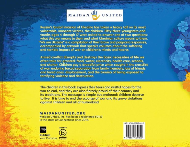 Russia's brutal invasion of Ukraine has taken a heavy toll on its most vulnerable, innocent victims, the children. Fifty-five youngsters and youths ages 4 through 17 were asked to answer one of two questions: what this war means to them and what Ukrainian culture means to them. "We are Ukraine" is a compilation of their brave and poignant responses, accompanied by artwork that speaks volumes about the suffering and terrible impact of war on children's minds and hearts. Armed conflict disrupts and destroys the basic necessities of life we often take for granted: food, water, electricity, health care, schools, and shelter. Children pay a dreadful price when caught in the crossfire of war, enduring forced separation from family members, loss of friends and loved ones, displacement, and the trauma of being exposed to terrifying violence and destruction. The children in this book express their fears and wistful hopes for the war to end, and they are also fiercely proud of their country and its traditions. The message is simple but profound: children deserve to live. It is time to end the scourge of war and its grave violations against children and all of humankind. Russia's brutal invasion of Ukraine has taken a heavy toll on its most vulnerable, innocent victims, the children. Fifty-five youngsters and youths ages 4 through 17 were asked to answer one of two questions: what this war means to them and what Ukrainian culture means to them. "We are Ukraine" is a compilation of their brave and poignant responses, accompanied by artwork that speaks volumes about the suffering and terrible impact of war on children's minds and hearts. Armed conflict disrupts and destroys the basic necessities of life we often take for granted: food, water, electricity, health care, schools, and shelter. Children pay a dreadful price when caught in the crossfire of war, enduring forced separation from family members, loss of friends and loved ones, displacement, and the trauma of being exposed to terrifying violence and destruction. The children in this book express their fears and wistful hopes for the war to end, and they are also fiercely proud of their country and its traditions. The message is simple but profound: children deserve to live. It is time to end the scourge of war and its grave violations against children and all of humankind.
