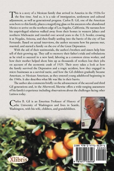This is a story of Mexican family that arrived in America in the 1920s for the first time. And so, it is a tale of immigration, settlement and cultural adjustment, as well as generational progress. Carlos B. Gil, one of the American sons born to this family, places a magnifying glass on his ancestors who abandoned Mexico to arrive on the northern edge of Los Angeles, California. He narrates how his unprivileged relatives walked away from their homes in western Jalisco and northern Michoacán and traveled over several years to the U.S. border, crossing it at Nogales, Arizona, and then finally settling into the barrio of the city of San Fernando. Based on actual interviews, the author recounts how his parents met, married, and started a family on the eve of the Great Depression. With the aid of their testimonials, the author¿s brothers and sisters help him tell of their growing up. They call to memory their father¿s trials and tribulations as he tried to succeed in a new land, laboring as a common citrus worker, and how their mother helped shore him up as thousands of workers lost their jobs on account of the economic crash of 1929. Their story takes a look at how the family survived the Depression and a tragic accident, how they engaged in micro businesses as a survival tactic, and how the Gil children gradually became American, or Mexican American, as they entered young adulthood beginning in the 1940s. It also describes what life was like in their barrio. The author also comments briefly on the advancement of the second and third Gil generations and, in the Afterword, likewise offers a wide-ranging assessment of his family¿s experience including observations about the challenges facing other Latinos today.