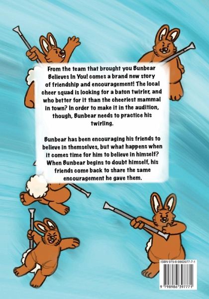 From the team that brought you Bunbear Believes In You! comes a brand new story of friendship and encouragement! The local cheer squad is looking for a baton twirler, and who better for it than the cheeriest mammal in town? In order to make it in the audition, though, Bunbear needs to practice his twirling. Bunbear has been encouraging his friends to believe in themselves, but what happens when it comes time for him to believe in himself? When Bunbear begins to doubt himself, his friends come back to share the same encouragement he gave them.