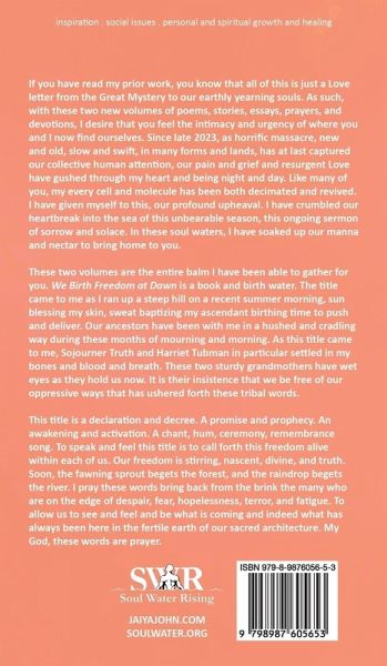 If you have read my prior work, you know that all of this is just a Love letter from the Great Mystery to our earthly yearning souls. As such, with these two new volumes of poems, stories, essays, prayers, and devotions, I desire that you feel the intimacy and urgency of where you and I now find ourselves. Since late 2023, as horrific massacre, new and old, slow and swift, in many forms and lands, has at last captured our collective human attention, our pain and grief and resurgent Love have gushed through my heart and being night and day. Like many of you, my every cell and molecule has been both decimated and revived. I have given myself to this, our profound upheaval. I have crumbled our heartbreak into the sea of this unbearable season, this ongoing sermon of sorrow and solace. In these soul waters, I have soaked up our manna and nectar to bring home to you. These two volumes are the entire balm I have been able to gather for you. We Birth Freedom at Dawn is a book and birth water. The title came to me as I ran up a steep hill on a recent summer morning, sun blessing my skin, sweat baptizing my ascendant birthing time to push and deliver. Our ancestors have been with me in a hushed and cradling way during these months of mourning and morning. As this title came to me, Sojourner Truth and Harriet Tubman in particular settled in my bones and blood and breath. These two sturdy grandmothers have wet eyes as they hold us now. It is their insistence that we be free of our oppressive ways that has ushered forth these tribal words. Sojourner and Harriet... Have you ever seen two monarch butterfly mates dancing in sunlight? They may to our eyes seem incredibly light of wing. Their flight, though, is a consequence of unimaginable struggle and endurance. And yet, here they are, still dancing, still joyful, filled with the orange of sun, bringing forth their generations. This title, We Birth Freedom at Dawn, is what its offering is: A radical call. An invocation. A summons. To stir and galvanize and mobilize us. The word We is for our collective humanity. Birth speaks to our unconquerable Divine Feminine and its reclaimed role as we go forward, for the conception, gestation, and birth labor. For we already have this freedom. We do not have to chase it down. We have only to bring forth what is already in us and of us. The word Freedom: An acknowledgement of my life's work and ministry, including my earlier and kindred book Freedom: Medicine Words for Your Brave Revolution. And Dawn, a hopeful word, for our freedom soon come. It is not long now, dear soul. Not long. Our dark night of the soul too has its end. This title is a declaration and decree. A promise and prophecy. An awakening and activation. A chant, hum, ceremony, remembrance song. To speak and feel this title is to call forth this freedom alive within each of us. Our freedom is stirring, nascent, divine, and truth. Soon, the fawning sprout begets the forest, and the raindrop begets the river. I pray these words bring back from the brink the many who are on the edge of despair, fear, hopelessness, terror, and fatigue. To allow us to see and feel and be what is coming and indeed what has always been here in the fertile earth of our sacred architecture. My God, these words are prayer.
