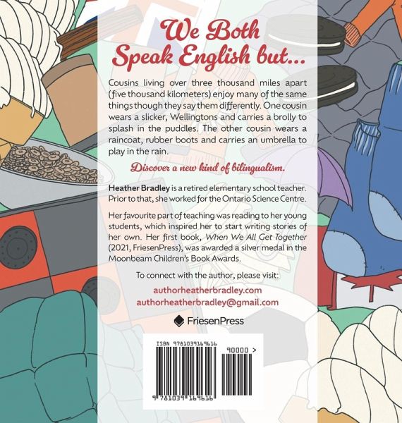 Two cousins. Two countries. One language - sort of Cousins living over three thousand miles apart (five thousand kilometers) enjoy many of the same things though they say them differently. One cousin wears a slicker, Wellingtons and carries a brolly to splash in the puddles. The other cousin wears a raincoat, rubber boots and carries an umbrella to play in the rain. Discover a new kind of bilingualism.