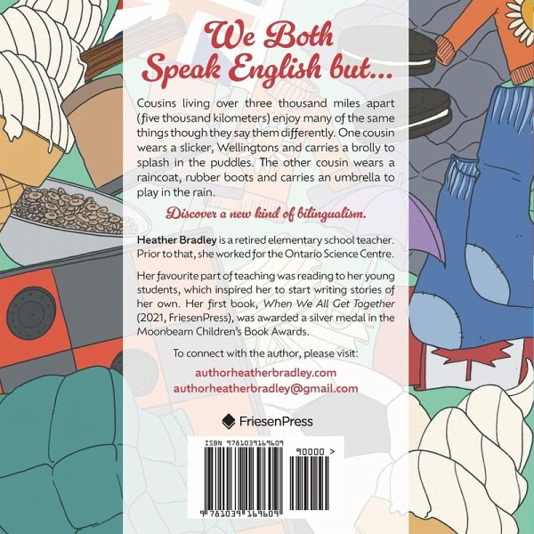 Two cousins. Two countries. One language - sort of Cousins living over three thousand miles apart (five thousand kilometers) enjoy many of the same things though they say them differently. One cousin wears a slicker, Wellingtons and carries a brolly to splash in the puddles. The other cousin wears a raincoat, rubber boots and carries an umbrella to play in the rain. Discover a new kind of bilingualism.