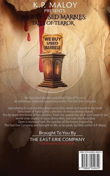 We Buy Used Marbles and Other Tales of Terror by K.P. Maloy Dive into a chilling anthology that uncovers the malevolent influence of The East Erie Company, an enigmatic entity based in the quaint town of Patrick, Ohio. Specializing in fates that are not just terrifying but soul-crushing, these tales will leave you questioning the very fabric of reality. From its core story set against the backdrop of Cincinnati to the global repercussions felt in narratives like "Super Brave Man," K.P. Maloy masterfully weaves a web of horror that knows no boundaries. Discover how, under the sinister shadow of The East Erie Company, even prestigious events like the Australian Open aren't safe from its terror. Ohio's very own K.P. Maloy brings to life a series of spine-tingling stories that demonstrate the expansive and insidious reach of a brand of fear that is truly unparalleled. Whether you're a seasoned horror aficionado or a curious newcomer, "We Buy Used Marbles and Other Tales of Terror" promises a journey that will both terrify and captivate. Don't miss out on this haunting collection that showcases the dark depths of human imagination.