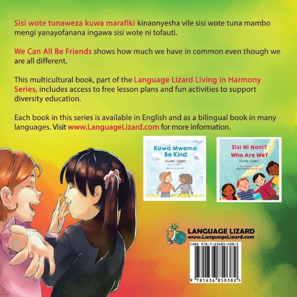 "Beautiful messages within inspiring art!" - Zeynep E., Language Acquisition Specialist We Can All Be Friends shows how much we have in common even though we are all different. Illustrations include diverse characters and settings from around the world, allowing children to see themselves in the book and learn about the world around them. This multicultural book, part of the Language Lizard Living in Harmony Series, includes access to free lesson plans and fun activities to support diversity education. This book is available in English-only and in many bilingual editions. The other books in the Language Lizard Living in Harmony Series are:Be Kind by Livia Lemgruber Who Are We? by Anneke Forzani, Illustrated by Maria Russo