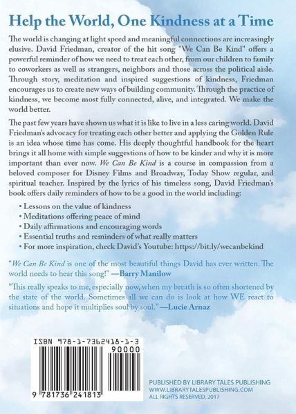 One Kindness at a Time Be kind: The world is changing at lightening speed, and meaningful connections are increasingly elusive. David Friedman, creator of the hit song "We Can Be Kind" offers a powerful reminder of how we need to treat each other, from children to family to coworkers as well as strangers, neighbors and those across the political aisle. Through story, meditation and suggestions of kindness, Friedman encourages us to create new ways of building community. Through the practice of kindness, we become most fully connected, alive, and integrated. Practicing The Golden Rule: The past few years have shown us what it is like to live in a less caring world. David Friedman's advocacy for treating each other better and applying the Golden Rule is an idea whose time has come. His deeply thoughtful handbook for the heart brings it all home with simple suggestions of how to be kinder and why it is more important than ever now. Compassion and empathy: We Can Be Kind is a course in compassion from a beloved composer for Disney Films and Broadway, Daily Show regular, and Unity Church spiritual leader. The book provides: Lessons on the value of kindness Inspiring meditations Daily affirmations Essential truths