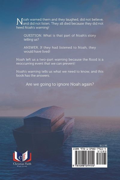 Noah warned them and they laughed, did not believe, and did not listen. They all died because they did not heed Noah's warning! Question. What is that part of Noah's story telling us? Answer. If they had listened to Noah, they would have lived! Noah left us a two-part warning because the flood is a reoccurring event that we can prevent! Noah's warning tells us what we need to know, and this book has the answers. Are we going to ignore Noah again?