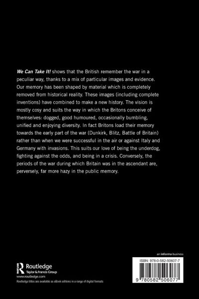 `We Can Take It!' shows that the British remember the war in a peculiar way, thanks to a mix of particular images and evidence. Our memory has been shaped by material which is completely removed from historical reality. These images (including complete inventions) have combined to make a new history. The vision is mostly cosy and suits the way in which the Britons conceive of themselves: dogged, good humoured, occasionally bumbling, unified and enjoying diversity. In fact Britons load their memory towards the early part of the war (Dunkirk, Blitz, Battle of Britain) rather than when we were successful in the air or against Italy and Germany with invasions. This suits our love of being the underdog, fighting against the odds, and being in a crisis. Conversely, the periods of the war during which Britain was in the ascendant are, perversely, far more hazy in the public memory.