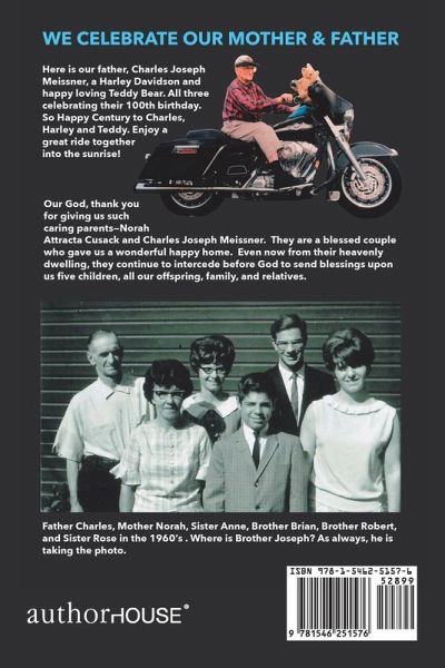 "Honor thy father and thy mother." This is the fourth commandment from the ten God gave us through Moses in the Bible. This fourth follows the initial three signifying our duties to the Supreme Being. After God, our next obligation is to our parents. This shows the importance of parents. Notice the word is "honor." It does not say "obey"; but "honor" certainly includes "obedience." Furthermore, this commandment does not end when we each reach maturity. The commandment of honor signifies we must respect our parents all their lives. Our mother was Norah Attracta Cusack. Our father was Joseph Charles Meissner. By the usual social standards, they were very ordinary people on this planet. However, they possessed their own wonderful beauty and intelligence. They were most extraordinary parents who welcomed us to life, took care of our needs, ensured we received great educations, and devoted their lives unselfishly to us for decades. But they gave us much more than our mere bodies. They gave us faith, hope, and love during their long lives. They showed us how to live as God urges us to live. They continuously nourished us spiritually from our mother's nightly "demands" to kneel in the living room praying the rosary to our Blessed Virgin to our father who drove us even in the blinding snow, freezing cold, and storms to church every week, ensuring we arrived on time. Here are words from my brother Robert for our parents: "As for our son, Scott, [who suffering from severe PTSD, ended his life], I agree he is somewhere around and still present in the universe. So are our mom and dad. I think after we die, we will learn how all this is done-you know Mom and Dad are the greatest proof of God, religion, and an afterlife. They were so good and worked tirelessly for our family. If you asked them about religion, the church, and faith, they might say it really doesn't matter, except you treat your fellow human beings with dignity and acknowledge God as Father. The rest of the argument really doesn't mean that much." So to Mom and Dad, we celebrate your lives and say an enormous thank-you.