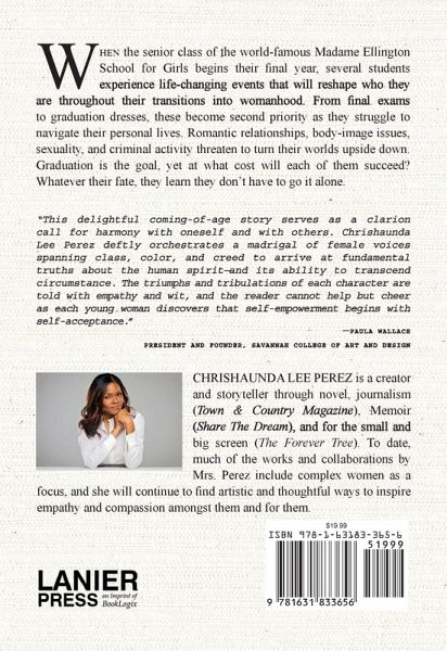 WHEN THE SENIOR CLASS of the world-famous Madame Ellington School for Girls begins their final year, several students experience life-changing events that will reshape who they are throughout their transitions into womanhood. From final exams to graduation dresses, these become second priority as they struggle to navigate their personal lives. Romantic relationships, body-image issues, sexuality, and criminal activity threaten to turn their worlds upside down. Graduation is the goal, yet at what cost will each of them succeed? Whatever their fate, they learn they don't have to go it alone. "This delightful coming-of-age story serves as a clarion call for harmony with oneself and with others. Chrishaunda Lee Perez deftly orchestrates a madrigal of female voices spanning class, color, and creed to arrive at fundamental truths about the human spirit-and its ability to transcend circumstance. The triumphs and tribulations of each character are told with empathy and wit, and the reader cannot help but cheer as each young woman discovers that self-empowerment begins with self-acceptance." - PAULA WALLACE, PRESIDENT AND FOUNDER, SAVANNAH COLLEGE OF ART AND DESIGN