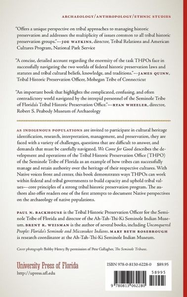 Offers a unique perspective on tribal approaches to managing historic preservation and addresses the multiplicity of issues common to all tribal historic preservation groups.”—Joe Watkins, director, Tribal Relations and American Cultures Program, National Park Service “A concise, detailed account regarding the enormity of the task THPOs face in successfully navigating the two worlds of federal historic preservation laws and statutes and tribal cultural beliefs, knowledge, and traditions.”—James Quinn, Tribal Historic Preservation Officer, Mohegan Tribe of Connecticut “An important book. Highlights the complicated, confusing, and often contradictory world navigated by the intrepid personnel of the Seminole Tribe of Florida’s Tribal Historic Preservation Office.”—Ryan Wheeler, director, Robert S. Peabody Museum of Archaeology As indigenous populations are being invited to participate in cultural heritage identification, research, interpretation, management, and preservation, they are faced with a high volume of challenging questions and demands. We Come for Good describes the development and operations of the Tribal Historic Preservation Office (THPO) of the Seminole Tribe of Florida as an example of how tribes can successfully manage and retain authority over the heritage of their respective cultures. With Native voices front and center, this book demonstrates ways THPOs can work within federal and tribal governments to build capacity and uphold tribal values—core principles of a strong tribal historic preservation program.