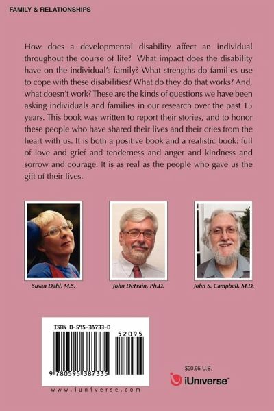 How does a developmental disability affect an individual throughout the course of life? What impact does the disability have on the individual's family? What strengths do families use to cope with these disabilities? What do they do that works? And, what doesn't work? These are the kinds of questions we have been asking individuals and families in our research over the past 15 years. This book was written to report their stories, and to honor these people who have shared their lives and their cries from the heart with us. It is both a positive book and a realistic book: full of love and grief and tenderness and anger and kindness and sorrow and courage. It is as real as the people who gave us the gift of their lives.