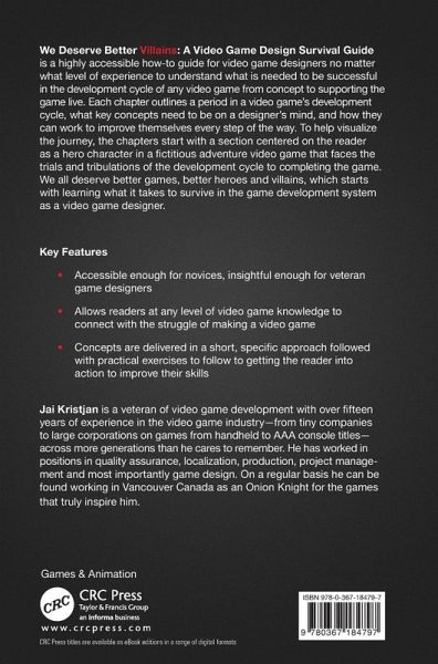 We Deserve Better Villains is a highly accessible how-to guide for video game designers no matter what level of experience to understand what is needed to be successful in the development cycle of any video game from concept to supporting the game live. Each chapter outlines a period in a video games development cycle, what key concepts need to be on a designers mind and how they can work to improve themselves every step of the way. To help visualize the journey the chapters start with a section centered on the reader as a hero character in a fictitious adventure video game that faces the trials and tribulations of the development cycle to completing the game. We all deserve better games, better heroes and villains which starts with learning what it takes to survive in the game development system as a videogame designer.