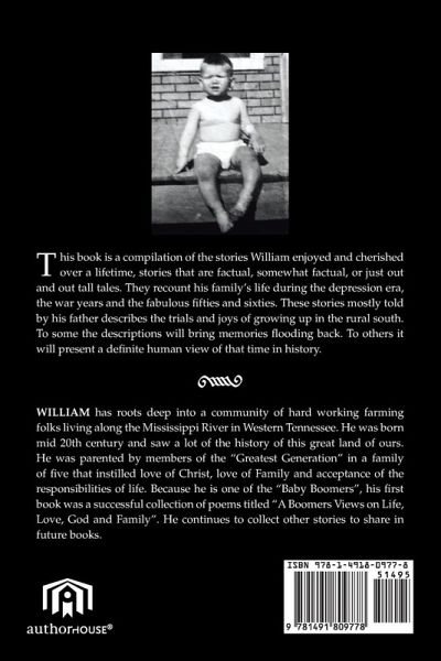 This book is a compilation of the stories William enjoyed and cherished over a lifetime, stories that are factual, somewhat factual, or just out and out tall tales. They recount his family's life during the depression era, the war years and the fabulous fifties and sixties. These stories mostly told by his father describes the trials and joys of growing up in the rural south. To some the descriptions will bring memories flooding back. To others it will present a definite human view of that time in history.