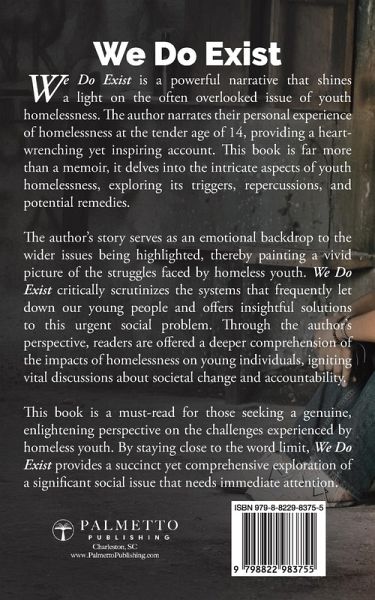 Surviving Life on the Streets at 14: An Insightful Journey Through Youth Homelessness - Causes, Impacts, and Potential Solutions Explored. In this compelling narrative, the author brings to life their experience as a homeless youth, casting a spotlight on a harsh reality that many choose to overlook. We Do Exist delves into the complexities of youth homelessness, from its root causes to its far-reaching consequences. The author's personal journey serves as a poignant backdrop to the broader issues at play, weaving a tale both heartbreaking and inspiring. More than just a memoir, this book presents a critical examination of the systems that often fail our youth, offering thoughtful insights and potential solutions to this pressing social issue. Through the author's eyes, readers gain a deeper understanding of homelessness and its impact on young lives, sparking important conversations about social change and responsibility. A must-read for anyone seeking a raw, honest, and enlightening perspective on the struggles faced by homeless youth.
