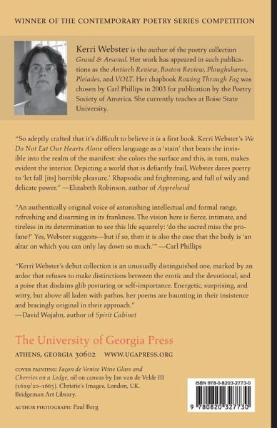 "What desire doesn't seem as of the distance across a sea?" asks the voice in Kerri Webster's debut collection of poetry, even as the poems attempt the transformation of that liminal space wherein word meets sense, loneliness meets solitude, and surface meets interior. Here, "the surface is our signature," and the image of stain presents a way for that surface to reflect that which it conceals. In this space, human intimacy encounters the transience and frailty of language, and through these encounters we discover that grace lies in "believing always in imprint."