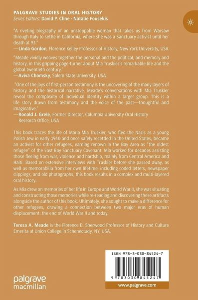 This book traces the life of Maria Mia Truskier, who fled the Nazis as a young Polish Jew in early 1940 and once safely resettled in the United States, became an activist for other refugees, earning renown in the Bay Area as "the oldest refugee" of the East Bay Sanctuary Covenant. Mia worked for decades assisting those fleeing from war, violence and hardship, mainly from Central America and Haiti. Based on extensive interviews with Truskier before she passed away, as well as memorabilia from her own lifetime, including coded letters, newspaper clippings, and old photographs, this book results in a complex and multi-layered oral history. As Mia drew on memories of her life in Europe and World War II, she was situating and constructing those memories while re-reading and discovering these artifacts alongside the author of this book, and ultimately relating the ways that she and her family years later sought to make a difference for other refugees, drawing a connection between two major eras of human displacement: the end of World War II and today.
