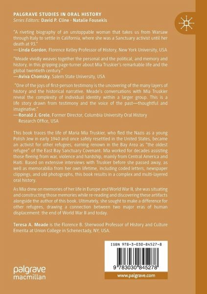 This book traces the life of Maria Mia Truskier, who fled the Nazis as a young Polish Jew in early 1940 and once safely resettled in the United States, became an activist for other refugees, earning renown in the Bay Area as "the oldest refugee" of the East Bay Sanctuary Covenant. Mia worked for decades assisting those fleeing from war, violence and hardship, mainly from Central America and Haiti. Based on extensive interviews with Truskier before she passed away, as well as memorabilia from her own lifetime, including coded letters, newspaper clippings, and old photographs, this book results in a complex and multi-layered oral history. As Mia drew on memories of her life in Europe and World War II, she was situating and constructing those memories while re-reading and discovering these artifacts alongside the author of this book, and ultimately relating the ways that she and her family years later sought to make a difference for other refugees, drawing a connection between two major eras of human displacement: the end of World War II and today.