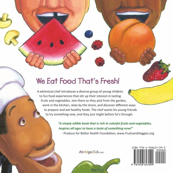 A whimsical chef introduces a diverse group of young children to fun food experiences that stir up their interest in tasting fruits and vegetables. Join them as they pick from the garden, work in the kitchen, relax by the shore, and discover different ways to prepare and eat healthy foods. The chef wants his young friends to try something new, and they just might before he's through. "A simply edible book that is rich in colorful fruits and vegetables. Inspires all ages to have a taste of something new!" - Produce for Better Health Foundation, www.FruitsandVeggies.org Convincing young children to taste new fruits and vegetables is an age-old challenge, but they might discover they like food when it's prepared a different way since the texture and flavor of food changes based on the way it is prepared. Children might discover that they like raw versus cooked carrots, apple sauce versus sliced apples, soft celery in soup versus crisp, crunchy celery sticks, , grilled onions versus raw, whole fruit versus blended, and so forth. Taste buds are always changing, so wouldn't it be terrific if children could be convinced to taste the same food cooked a different way and try food multiple times? Easy rhymes and repetitive verses are combined with deliciously colorful pastel illustrations. 32 pages Size: 8.5" H x 8.5" W Available in English and Spanish In addition to the nutrition aspect of this book, there is a STEM component that is well worth sharing. Connecting literature, science, and hands-on discovery gives children a more concrete understanding of new concepts that relate to food. Benefits: Encourages children to taste new foods Presents over 50 fruits and vegetables to identify Introduces various ways to prepare and eat fruits and vegetables Promotes experimentation with tools: thermometer, knife, manual juicer, spoons, ladle, baggies, peeler, whisk, spurtle, spatula, blender, colander, skewers, cookware, etc. Provides an opportunity to count, describe, compare, and contrast foods Optional companion song, spoken word, and instrumental - downloadable for a low additional cost This book is printed on demand. Please flip through at least one of the books you receive and contact the publisher directly as soon as possible if you have any quality concerns. Here are some helpful tips to make your experience worthwhile: Declutter the work area, so the children can focus on tasks. Begin with simple recipes. Display measure and mix photos or diagrams of simple recipes for pre-readers. Follow the children's interests, offering complex extensions as they master skills. Supply blank paper and writing/drawing implements for recording observations. Create a photo or video record of the activity that can be reviewed and discussed later to improve memory skills. Encourage the use of age-appropriate kitchen tools if they apply. Ask open-ended questions that make children think critically. Be a good role model. The children are watching and listening. Bulk Orders: This title is available in bulk directly from the publisher for early childhood and nutrition programs, conferences, non-profit initiatives, licensing, or grants that promote healthy eating, taste tests, fruits and vegetables, gardening, farm-to-table, and anti-obesity. Contact the publisher directly for quotes, orders, and discounted pricing. ¿