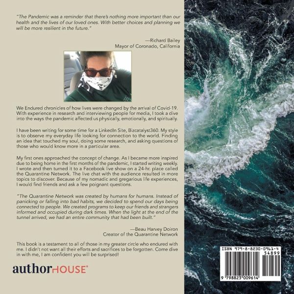 "The Pandemic was a reminder that there's nothing more important than our health and the lives of our loved ones. With better choices and planning we will be more resilient in the future." -Richard Bailey Mayor of Coronado, California We Endured chronicles of how lives were changed by the arrival of Covid-19. With experience in research and interviewing people for media, I took a dive into the ways the pandemic affected us physically, emotionally, and spiritually. I have been writing for some time for a LinkedIn Site, Bizcatalyst360. My style is to observe my everyday life looking for connection to the world. Finding an idea that touched my soul, doing some research, and asking questions of those who would know more in a particular area. My first ones approached the concept of change. As I became more inspired due to being home in the first months of the pandemic, I started writing weekly. I wrote and then turned it to a Facebook live show on a 24-hr. place called the Quarantine Network. The live chat with the audience resulted in more topics to discover. Because of my nomadic and gregarious life experiences, I would find friends and ask a few poignant questions. "The Quarantine Network was created by humans for humans. Instead of panicking or falling into bad habits, we decided to spend our days being connected to people. We created programs to keep our friends and strangers informed and occupied during dark times. When the light at the end of the tunnel arrived, we had an entire community that had been built." -Beau Harvey Doiron Creator of the Quarantine Network This book is a testament to all of those in my greater circle who endured with me. I didn't not want all their efforts and sacrifices to be forgotten. Come dive in with me, I am confident you will be surprised!