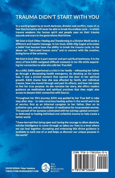 In a world gripped by so much darkness, division and conflict, many of us fear that humanity will never be able to break the endless cycle - in which trauma weakens the human spirit and people pass on their trauma wounds and scars to the generations that follow. We Exist in Each Other: Healing and Transforming in a Divisive World sends a different and hopeful message. In her book, Edith Alig Gagné articulates a belief that humans have the ability to break the trauma cycle, to rise above our "fabricated human story" and to connect with the creative, loving force of the universe. We Exist in Each Other is part memoir and part spiritual testimony. It is the story of how Edith navigated difficult moments in her life while expanding her connection to what she calls her True Self. As a child, Edith experienced a crisis in her family - witnessing her father go through a devastating health emergency. As shocking as the scene was, it was a pivotal moment that opened the door to her spiritual growth. Edith shares how she was affected by family and individual trauma, how she moved through and past its effects, and how she came to live her true purpose. As she narrates her story, she offers readers guidance on meditations and spiritual practices that they might also access to deepen their connection with Source. Throughout her life's journey, Edith was guided by her True Self to take step after step - to take conscious healing action in the world and to be of service, first as an informal caregiver to her father, then on to palliative care, and as a facilitator of meditation for incarcerated women. This pursuit of her purpose culminated with her joining a global community dedicated to healing individual and collective trauma to help create a better world. "I have learned that being open and having the courage to allow absolute, infinite intelligence to come through us takes our lives to a level where we can heal together. Accepting and embracing this divine guidance is available to each one of us and helps us discover our unique purpose in the world." Edith Alig Gagné is the daughter of European immigrants to Canada and has lived most of her life in northwestern Ontario. Both her parents' experience of war overseas and her childhood immersed in wild nature have been profound influences on her journey. Edith is devoted to a life of service in settings that include palliative care and correctional facilities. She has facilitated mind-fulness and meditation sessions for incarcerated women; for patients, clients and caregivers in health-care settings; and for palliative care summits, non-profit organizations and the general public. Edith holds an Honours BA degree in Psychology and Gerontology from Lakehead University. Additionally, she is a Chopra Center-certified instructor in "Perfect Health: Ayurvedic Lifestyle" and "Primordial Sound Meditation," with training based on the teachings of Dr. Deepak Chopra and Dr. David Simon. She has taken programs like "An Advanced Program to Intensify Presence and Live Your Highest Purpose," from Eckhart Tolle's School of Awakening. Edith is committed to connecting with like-hearted people to evolve to higher states of consciousness collectively and seeks to help integrate, heal and transform personal and collective trauma on a global scale. To further enhance her ability to be of service to others, she has completed an intensive, global program based in Germany and the U.S: Timeless Wisdom Training (TWT) with Thomas Hübl through the Academy of Inner Science. Learn more about Edith at edithaliggagne.com