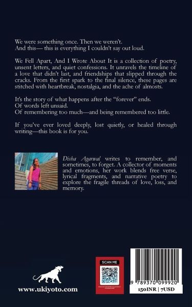 "We were something once. Then we weren't. And this- this is everything I couldn't say out loud. We Fell Apart, And I Wrote About It is a collection of poetry, unsent letters, and quiet confessions. It unravels the timeline of a love that didn't last, and friendships that slipped through the cracks. From the first spark to the final silence, these pages are stitched with heartbreak, nostalgia, and the ache of almosts. It's the story of what happens after the "forever" ends. Of words left unsaid. Of remembering too much-and being remembered too little. If you've ever loved deeply, lost quietly, or healed through writing-this book is for you."