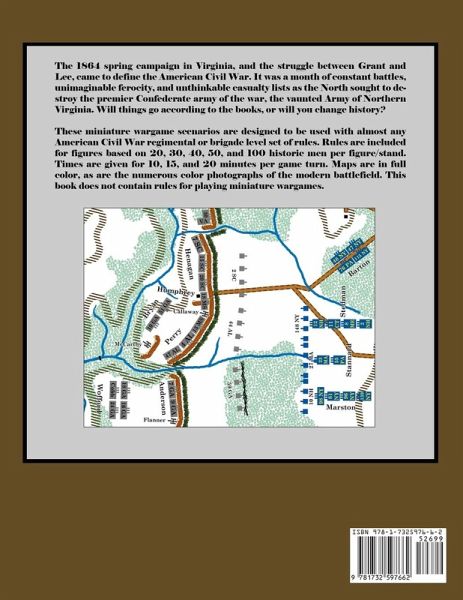 The 1864 spring campaign in Virginia, and the struggle between Grant and Lee, came to define the American Civil War. It was a month of constant battles, unimaginable ferocity, and unthinkable casualty lists as the North sought to destroy the premier Confederate army of the war, the vaunted Army of Northern Virginia. Will things go according to the books, or will you change history? These miniature wargame scenarios are designed to be used with almost any American Civil War regimental or brigade level set of rules. Rules are included for figures based on 20, 30, 40, 50, and 100 historic men per figure/stand. Times are given for 10, 15, and 20 minutes per game turn. Maps are in full color, as are the numerous color photographs of the modern battlefield. This book does not contain core rules for playing miniature wargames.