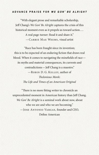 "In his most recent book, Who We Be, Jeff Chang looked at how art and culture effected massive social changes in American society. Since the book was published, the country has been gripped by waves of racial discord, most notably the protests in Ferguson, Missouri. In these highly relevant, powerful essays, Chang examines some of the most contentious issues in the current discussion of race and inequality. Built around a central essay looking at the rise of the Black Lives Matter movement and the eventsin Ferguson, Missouri, surrounding the death of Michael Brown, Chang questions the value of "the diversity discussion" in an era of increasing racial and economic segregation. He unpacks the return of student protest across the country and reveals how the debate over inclusion and free speech was presaged by similar protests in the 1980s and 1990s. The author of Can't Stop Won't Stop looks at how culture impacts our understanding of the politics of this polarized moment. Throughout these essays Chang includes the voices of many of the leading activists as he charts how popular voices on the ground and in social media have catalyzed the push for protest and change."