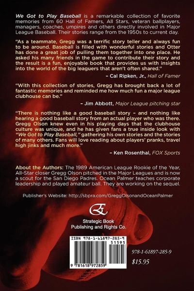 We Got to Play Baseball is a remarkable collection of favorite memories from 60 Hall of Famers, All Stars, veteran ballplayers, managers, coaches, umpires and others directly involved in Major League Baseball. Their stories range from the 1950s to current day. "As a teammate, Gregg was a terrific story teller and always fun to be around. Baseball is filled with wonderful stories and Otter has done a great job of pulling them together into one place. He asked his many friends in the game to contribute their story and the result is a fun, enjoyable book that provides us with insights into the world of the big leaguers that aren't often shared." - Cal Ripken, Jr., Hall of Famer "With this collection of stories, Gregg has brought back a lot of fantastic memories and reminded me how much fun a major league clubhouse can be." - Jim Abbott, Major League pitching star There is nothing like a good baseball story - and nothing like hearing a good baseball story from an actual player who was there. Gregg Olson knew even in his playing days that the clubhouse culture was unique, and he has given fans a true inside look with "We Got to Play Baseball," gathering his own stories and the stories of many others. Fans will love reading about players' pranks, travel high jinks and much more." - Ken Rosenthal, FOX Sports About the Authors: The 1989 American League Rookie of the Year,All-Star closer Gregg Olson pitched in the Major Leagues and is now a scout for the San Diego Padres. Ocean Palmer teaches corporate leadership and played amateur ball. They are working on the sequel. Publisher's Website: http://sbpra.com/GreggOlsonandOceanPalmer