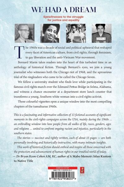 The 1960s was a decade of social and political upheaval that reshaped every facet of American culture, from civil rights, through feminism, to gay liberation and the anti-Vietnam War movement. Bernard Marin takes readers into the heart of this turbulent time in an anthology of historical fiction. Through Bernard's eyes, we join a young journalist who witnesses both the Chicago riot of 1968, and the uproarious trial of the ringleaders who came to be called the Chicago Seven. We follow a university student who finds love while participating in the famous civil rights march over the Edmund Pettus Bridge in Selma, Alabama, and witness a chance encounter at a department store lunch counter that transforms a young, Southern white woman into a civil rights activist. These colourful vignettes open a unique window into the most compelling chapters of the tumultuous 1960s.