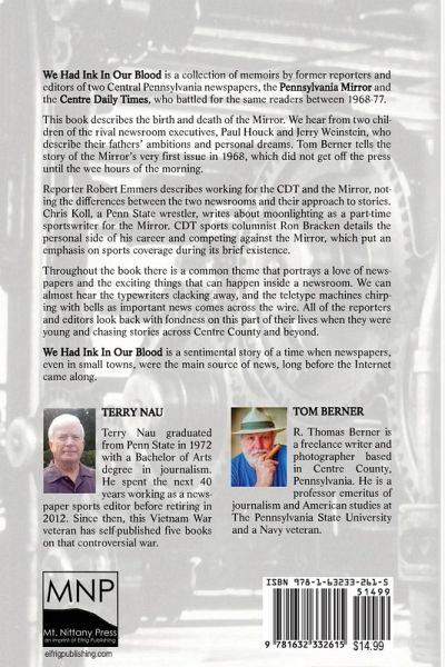 We Had Ink In Our Blood is a collection of memoirs by former reporters and editors of two Central Pennsylvania newspapers, the Pennsylvania Mirror and the Centre Daily Times, who battled for the same readers between 1968-77. This book describes the birth and death of the Mirror. We hear from two children of the rival newsroom executives, Paul Houck and Jerry Weinstein, who describe their fathers' ambitions and personal dreams. Tom Berner tells the story of the Mirror's very first issue in 1968, which did not get off the press until the wee hours of the morning. Reporter Robert Emmers describes working for the CDT and the Mirror, noting the differences between the two newsrooms and their approach to stories. Chris Koll, a Penn State wrestler, writes about moonlighting as a part-time sportswriter for the Mirror. CDT sports columnist Ron Bracken details the personal side of his career and competing against the Mirror, which put an emphasis on sports coverage during its brief existence. Throughout the book there is a common theme that portrays a love of newspapers and the exciting things that can happen inside a newsroom. We can almost hear the typewriters clacking away, and the teletype machines chirping with bells as important news comes across the wire. All of the reporters and editors look back with fondness on this part of their lives when they were young and chasing stories across Centre County and beyond. We Had Ink In Our Blood is a sentimental story of a time when newspapers, even in small towns, were the main source of news, long before the Internet came along. TERRY NAU Terry Nau graduated from Penn State in 1972 with a Bachelor of Arts degree in journalism. He spent the next 40 years working as a newspaper sports editor before retiring in 2012. Since then, this Vietnam War veteran has self-published five books on that controversial war. TOM BERNER R Thomas Berner is a freelance writer and photographer based in Centre County, Pennsylvania. He is a professor emeritus of journalism and American studies at The Pennsylvania State University and a Navy veteran.