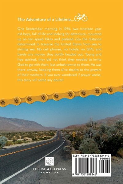 The adventure of a lifetime... One September morning in 1974, two nineteen-year-old boys, full of life and looking for adventure, mounted up on ten speed bikes and pedaled into the distance, determined to traverse the United States from sea to shining sea. No cell phones, no hotels, no GPS, and barely any money...what could possibly go wrong? Bold and free spirited, they didn't think they needed to invite God to go with them, but little did they know, He was there all along keeping them alive, thanks to the prayers of their mothers. If you ever wondered if prayer works, this story will settle any doubt!