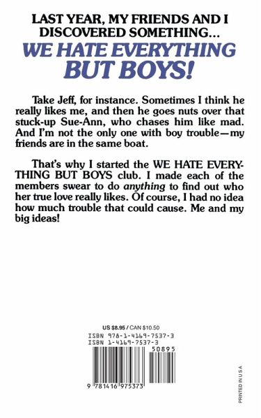 Take Jeff, for instance. Sometimes I think he really likes me, and then he goes nuts over that stuck-up Sue-Ann, who chases him like mad. And I'm not the only one with boy trouble - my friends are in the same boat. That why I started the WE HATE EVERYTHING BUT BOYS club. I made each of the members swear to do anything to find out who her true love really likes. Of course, I had no idea how much trouble that would cause. Me and my bid ideas!
