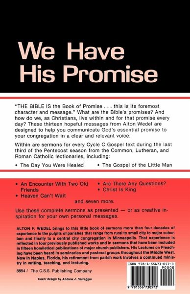 "The Bible is the book of promise... this is its foremost character and message." What are the Bible's promises? And how do we, as Christians, live within and for that promise every day? These thirteen hopeful messages from Alton Wedel are designed to help you communicate God's essential promise to your congregation in a clear and relevant voice. Within are sermons for every Cycle C gospel text during the last third of the Pentecost season from the Common, Lutheran, and Roman Catholic lectionaries, including: • The Day You Were Healed • An Encounter with Two Old Friends • Heaven Can't Wait • The Gospel of the Little Man • Are There Any Questions? • Christ Is King and seven more. Use these complete sermons as presented -- or as creative inspiration for your own personal messages. Alton F. Wedel brings to this little book of sermons more than four decades of experience in the pulpits of parishes that range from rural to small city to major suburban and finally to a central city congregation in Minneapolis. That experience is reflected in four previously published works and in sermons that have been included in fifteen homiletical publications of major church publishers. His lectures on preaching have been heard in seminaries and pastoral groups throughout the Mid West. Now in Naples, Florida, his retirement from parish work involves a continued ministry in writing, teaching, and lecturing.
