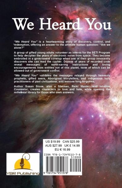 Reviewed By Susan Sewell for Readers' Favorite After extraterrestrial broadcasts have been translated, everyone responsible for decoding the data must flee for their lives in the engaging science-fiction paranormal novel, We Heard You by Susan Stone. Claire Montgomery is one out of the growing group of children born with a specific blue color in her aura. She is an Indigo. From the time Claire was very young, she exhibited unique talents that set her apart from other children. After graduating from college, Claire is hired by SETI to study the sounds collected from space over the past several decades. In an unexpected turn of events, Claire realizes she can see and read messages on the pages of data. They are words of hope and love. Unfortunately, someone leaks her findings to the press, and Claire and her colleagues have to go into hiding. The government steps in, but its agenda is unclear. Will Claire be allowed to share her discovery with the world? Featuring the work of SETI, We Heard You by Susan Stone is a thrilling science-fiction novel that explores the idea that the sounds emitted in space are a message to us from an extraterrestrial source. The magnificent plot embraces the idea that beings from other worlds have been contacting us all along. Filled with suspense, intrigue, charming and unique protagonists, wily villains, dramatic backdrops, and a captivating storyline, this extraordinary book had me on the edge of my seat from the first page until the last. Inspiring and enlightening, it is a spectacular science-fiction novel, and I recommend it to everyone who enjoys seeing the universe from a different perspective.