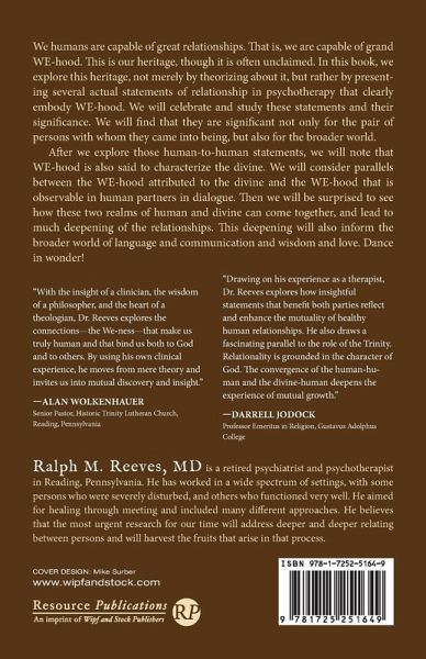 We humans are capable of great relationships. That is, we are capable of grand WE-hood. This is our heritage, though it is often unclaimed. In this book, we explore this heritage, not merely by theorizing about it, but rather by presenting several actual statements of relationship in psychotherapy that clearly embody WE-hood. We will celebrate and study these statements and their significance. We will find that they are significant not only for the pair of persons with whom they came into being, but also for the broader world. After we explore those human-to-human statements, we will note that WE-hood is also said to characterize the divine. We will consider parallels between the WE-hood attributed to the divine and the WE-hood that is observable in human partners in dialogue. Then we will be surprised to see how these two realms of human and divine can come together, and lead to much deepening of the relationships. This deepening will also inform the broader world of language and communication and wisdom and love. Dance in wonder!