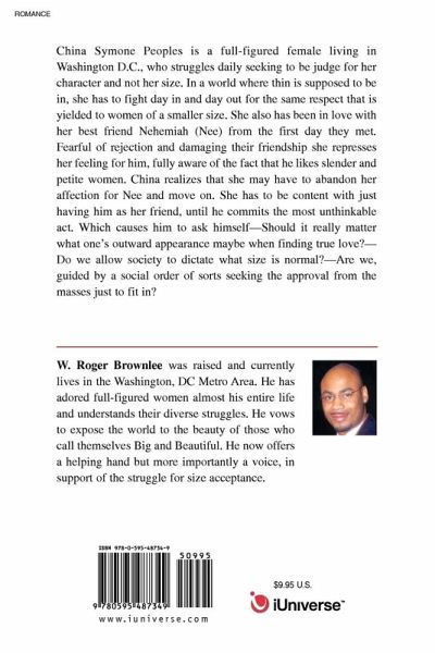 China Symone Peoples is a full-figured female living in Washington D.C., who struggles daily seeking to be judge for her character and not her size. In a world where thin is supposed to be in, she has to fight day in and day out for the same respect that is yielded to women of a smaller size. She also has been in love with her best friend Nehemiah (Nee) from the first day they met. Fearful of rejection and damaging their friendship she represses her feeling for him, fully aware of the fact that he likes slender and petite women. China realizes that she may have to abandon her affection for Nee and move on. She has to be content with just having him as her friend, until he commits the most unthinkable act. Which causes him to ask himself-Should it really matter what one's outward appearance maybe when finding true love?-Do we allow society to dictate what size is normal?-Are we, guided by a social order of sorts seeking the approval from the masses just to fit in?