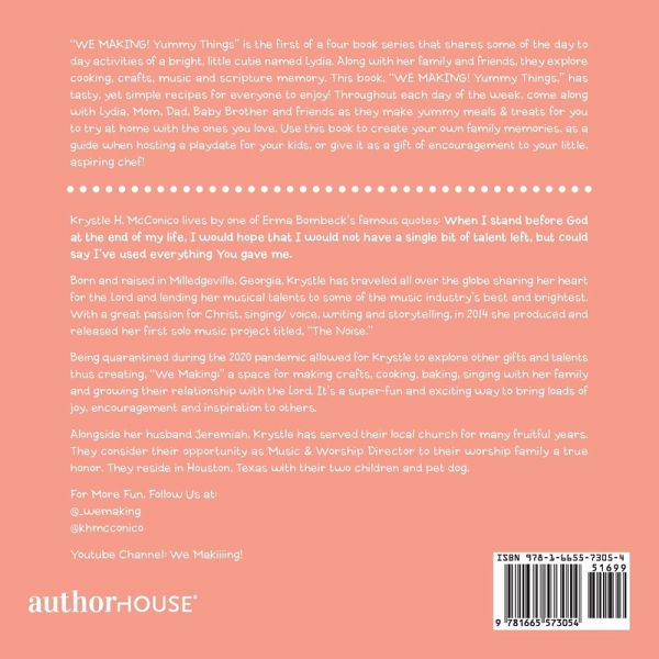 "WE MAKING! Yummy Things" is the first of a three book series showcasing tasty yet simple recipes for families and friends to enjoy! Throughout the seven days in a week, come along with Lydia, her Mom, Dad, baby Brother and friends as they make yummy meals & treats for you to try at home with those you love. Use this book to host an activity party for big kids or give it as a gift of encouragement to your little, aspiring chef! Many Blessings, Krystle H. McConico