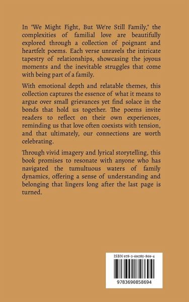 In "We Might Fight, But We're Still Family," the complexities of familial love are beautifully explored through a collection of poignant and heartfelt poems. Each verse unravels the intricate tapestry of relationships, showcasing the joyous moments and the inevitable struggles that come with being part of a family. With emotional depth and relatable themes, this collection captures the essence of what it means to argue over small grievances yet find solace in the bonds that hold us together. The poems invite readers to reflect on their own experiences, reminding us that love often coexists with tension, and that ultimately, our connections are worth celebrating. Through vivid imagery and lyrical storytelling, this book promises to resonate with anyone who has navigated the tumultuous waters of family dynamics, offering a sense of understanding and belonging that lingers long after the last page is turned.