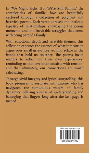 In "We Might Fight, But We're Still Family," the complexities of familial love are beautifully explored through a collection of poignant and heartfelt poems. Each verse unravels the intricate tapestry of relationships, showcasing the joyous moments and the inevitable struggles that come with being part of a family. With emotional depth and relatable themes, this collection captures the essence of what it means to argue over small grievances yet find solace in the bonds that hold us together. The poems invite readers to reflect on their own experiences, reminding us that love often coexists with tension, and that ultimately, our connections are worth celebrating. Through vivid imagery and lyrical storytelling, this book promises to resonate with anyone who has navigated the tumultuous waters of family dynamics, offering a sense of understanding and belonging that lingers long after the last page is turned.