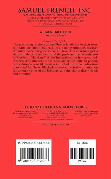 Comedy Characters: 3 male, 2 female Interior Set The two young brothers of the Oberon family live in their mansion with one faithful butler. They are happy until they discover the inheritance has gone to cousin Toni. This charming girl is shortly to descend on them, and the problem that faces the two is "Murder or Marriage?" When Toni arrives they have to consider whether (if murder) the means shall be the knife, or poison, or the dungeons, or (if marriage) which of the two is it who must marry her? Ian Stuart Black plays every conceivable variation on the alternate plots of the brothers, and the play is alive with wit and invention.