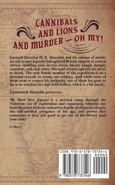 Cannibals and lions and murder - oh my! Intrepid librarian H. R. Huxtable and his column of misfits are out to save Jepson's beleaguered British outpost in central Africa-battling rock-strewn rivers, bloody jungle, hungry cannibals, and each other. His toad-witted captains are slaves to drink. The only female member of the expedition is on a personal crusade to stamp out celibacy. And while none of them seem to respect his authority, one of them has gone so far as to ventilate his tent with bullets, which is a bit much. Undaunted, Huxtable perseveres. We Must Save Jepson! is a satirical romp through the Victorian era of exploration and expansion, wherein our hero discovers hitherto unknown depths of character despite the self-satisfied arrogance of his age, and proves that sometimes it does you good to get out of the library (and your tent). Crikey!