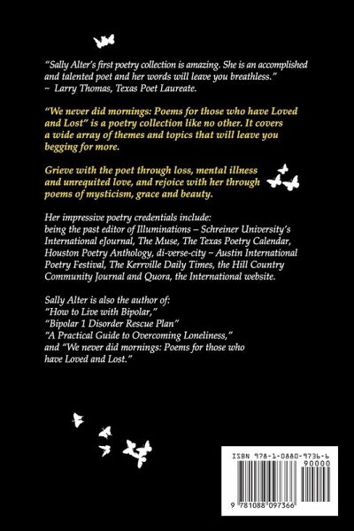 "Sally Alter's first poetry collection is amazing. She is an accomplished and talented poet and her words will leave you breathless." ~ Larry Thomas, Texas Poet Laureate. "We Never Did Mornings: Poems For Those Who Have Loved and Lost" is a poetry collection like no other. It covers a wide array of themes and topics that will leave you begging for more. Grieve with the poet through loss, mental illness and unrequited love, and rejoice with her through poems of mysticism, grace and beauty. Her impressive poetry credentials include: being the past editor of Illuminations - Schreiner University's International eJournal, The Muse, The Texas Poetry Calendar, Houston Poetry Anthology, di-verse-city ~ Austin International Poetry Festival, The Kerrville Daily Times, the Hill Country Community Journal and Quora, the International website. Sally Alter is also the author of "How to Live with Bipolar," "Bipolar 1 Disorder Rescue Plan," "A Practical Guide to Overcoming Loneliness," and "We Never Did Mornings: Poems For Those Who Have Loved and Lost."