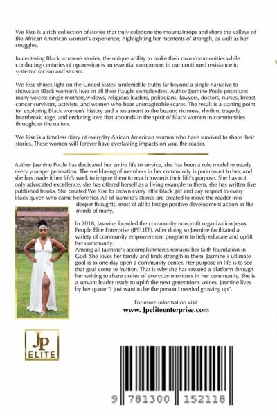 We Rise is a rich collection of stories that truly celebrate the mountaintops and share the valleys of the African American woman's experience; highlighting her moments of strength, as well as her struggles. In centering Black women's stories, the unique ability to make their own communities while combating centuries of oppression is an essential component in our continued resistance to systemic racism and sexism. We Rise shines light on the United States' undeniable truths far beyond a single narrative to showcase Black women's lives in all their complexities. Author Jasmine Poole prioritizes many voices: single mothers,widows, religious leaders, politicians, lawyers, doctors, nurses, breast cancer survivors, activists, and women who bear unimaginable scares. The result is a starting point for exploring Black women's history and a testament to the beauty, richness, rhythm, tragedy, heartbreak, rage, and enduring love that abounds in the spirit of Black women in communities throughout the nation. We Rise is a timeless diary of everyday African American women who have survived to share their stories. These women will forever have everlasting impacts on you, the reader.