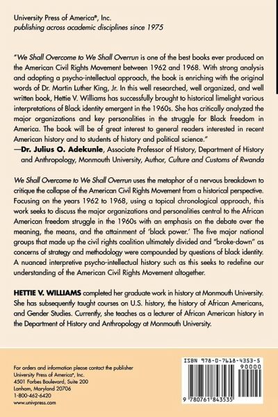 We Shall Overcome to We Shall Overrun uses the metaphor of a nervous breakdown to critique the collapse of the American Civil Rights Movement from a historical perspective. Focusing on the years 1962 to 1968, using a topical chronological approach, this work seeks to discuss the major organizations and personalities central to the African American freedom struggle in the 1960s with an emphasis on the debate over the meaning, the means, and the attainment of 'black power.' The five major national groups that made up the civil rights coalition ultimately divided and 'broke-down' as concerns of strategy and methodology were compounded by questions of black identity. A nuanced interpretive psycho-intellectual history such as this seeks to redefine our understanding of the American Civil Rights Movement altogether.