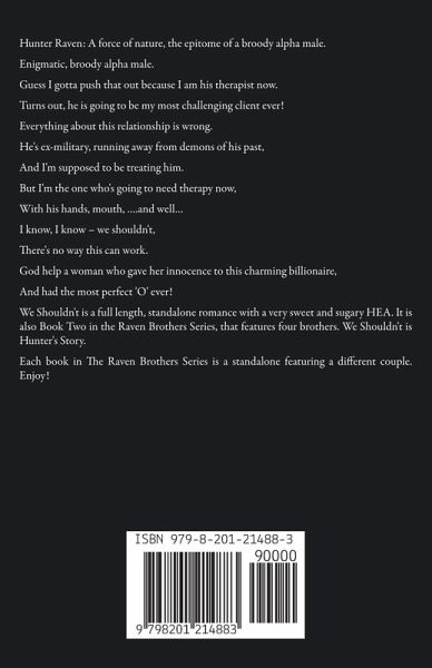 Hunter Raven: A force of nature, the epitome of a broody alpha male. Enigmatic, broody alpha male. Guess I gotta push that out because I am his therapist now. Turns out, he is going to be my most challenging client ever! Everything about this relationship is wrong. He's ex-military, running away from demons of his past, And I'm supposed to be treating him. But I'm the one who's going to need therapy now, With his hands, mouth, ….and well… I know, I know – we shouldn't, There's no way this can work. God help a woman who gave her innocence to this charming billionaire, And had the most perfect 'O' ever! We Shouldn't is a full length, standalone romance with a very sweet and sugary HEA. It is also Book Two in the Raven Brothers Series, that features four brothers. We Shouldn't is Hunter's Story. Each book in The Raven Brothers Series is a standalone featuring a different couple. Enjoy!