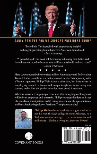 Have you wondered why over sixty million Americans voted for President Trump? You’ve heard from the politicians and media. Take a journey with a Trump supporter. Phillip Wells is not a politician, but he is astute in simplifying issues. His honest and unique insight on issues facing our country makes him the perfect voice for these proud Americans. Whether you’re a Trump supporter or not, this thought-provoking book will inform, empower, and entertain. Phillip connects the dots on issues like socialism, immigration, health care, guns, climate change, and taxes, and has a fascinating take on President Trump’s personality! Phillip Wells—from working at a gas station to pay his way through college in rural Arkansas, to a Walmart assistant manager, to a business owner and millionaire—Phillip is living his American Dream! Early reviews for We Support President Trump: "Incredible! This is packed with empowering insight! A thought-provoking book that every American should read!" - Luci Armstrong "A powerful read! This book will have many rethinking their beliefs and have all readers proud to be an American! Everyone should read and share!" - David Whitehurst