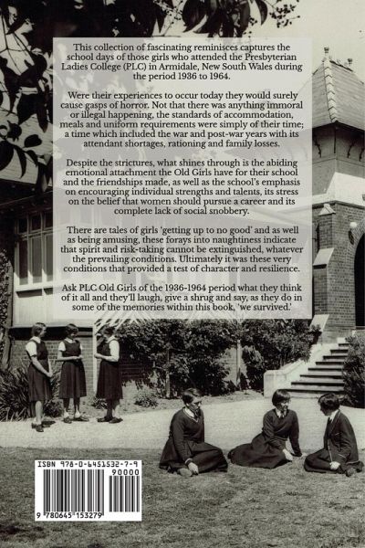 This collection of fascinating reminisces captures the school days of those girls who attended the Presbyterian Ladies College (PLC) in Armidale, New South Wales during the period 1936 to 1964. Were their experiences to occur today they would surely cause gasps of horror. Not that there was anything immoral or illegal happening, the standards of accommodation, meals and uniform requirements were simply of their time; a time which included the war and post-war years with its attendant shortages, rationing and family losses. Despite the strictures, what shines through is the abiding emotional attachment the Old Girls have for their school and the friendships made, as well as the school's emphasis on encouraging individual strengths and talents, its stress on the belief that women should pursue a career and its complete lack of social snobbery. There are tales of girls 'getting up to no good' and as well as being amusing, these forays into naughtiness indicate that spirit and risk-taking cannot be extinguished, whatever the prevailing conditions. Ultimately it was these very conditions that provided a test of character and resilience. Ask PLC Old Girls of the 1936-1964 period what they think of it all and they'll laugh, give a shrug and say, as they do in some of the memories within this book, 'We survived.'