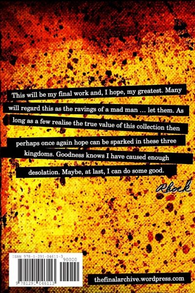 This will be my final work and, I hope, my greatest. Many will regard this as the ravings of a mad man ... let them. As long as a few realise the true value of this collection then perhaps once again hope can be sparked in these three kingdoms. Goodness knows I have caused enough desolation. Maybe, at last, I can do some good. Rhoek. --- The first novella by the writing group known as "The Final Archive."