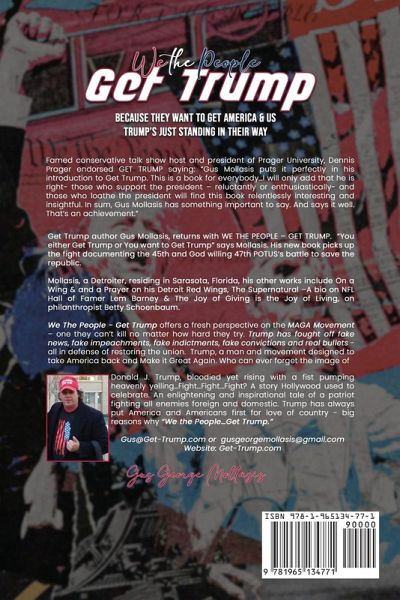 Famed conservative talk show host and president of Prager University, Dennis Prager endorsed GET TRUMP saying: "Gus Mollasis puts it perfectly in his introduction to Get Trump. This is a book for everybody...I will only add that he is right- those who support the president - reluctantly or enthusiastically- and those who loathe the president will find this book relentlessly interesting and insightful. In sum, Gus Mollasis has something important to say. And says it well. That's an achievement." Get Trump author Gus Mollasis, returns with WE THE PEOPLE - GET TRUMP. "You either Get Trump or You want to Get Trump" says Mollasis. His new book picks up the fight documenting the 45th and God willing 47th POTUS's battle to save the republic. Mollasis, a Detroiter, residing in Sarasota, Florida, his other works include On a Wing & and a Prayer on his Detroit Red Wings, The Supernatural -A bio on NFL Hall of Famer Lem Barney & The Joy of Giving is the Joy of Living, on philanthropist Betty Schoenbaum. We The People - Get Trump offers a fresh perspective on the MAGA Movement - one they can't kill no matter how hard they try. Trump has fought off fake news, fake impeachments, fake indictments, fake convictions and real bullets - all in defense of restoring the union. Trump, a man and movement designed to take America back and Make it Great Again. Who can ever forget the image of Donald J. Trump, bloodied yet rising with a fist pumping heavenly yelling...Fight...Fight...Fight? A story Hollywood used to celebrate. An enlightening and inspirational tale of a patriot fighting all enemies foreign and domestic. Trump has always put America and Americans first for love of country - big reasons why "We the People...Get Trump."